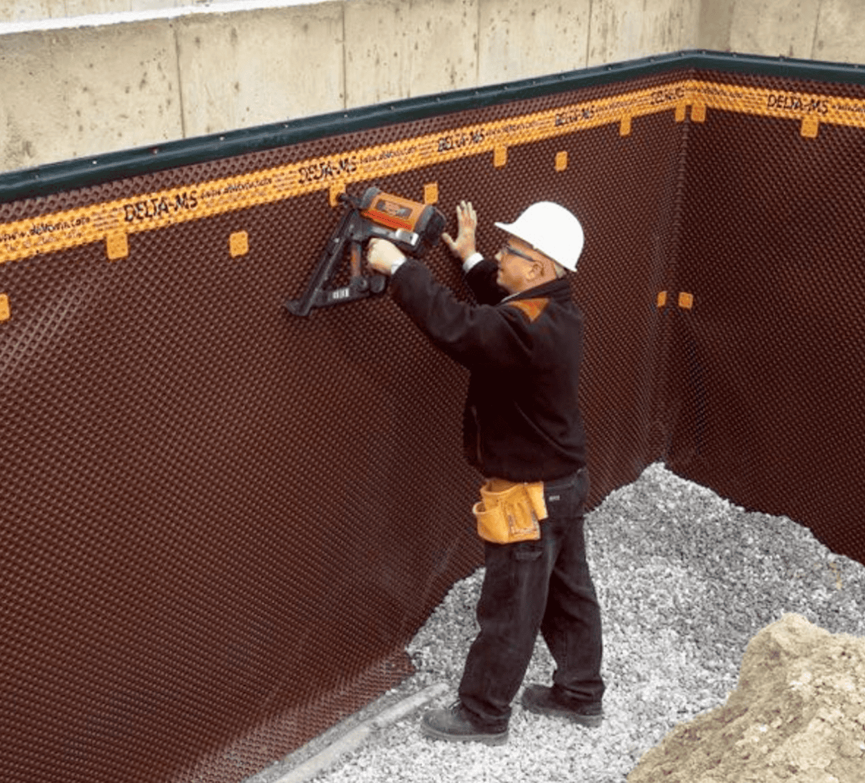 DELTA-MS stands out as a premier below grade moisture barrier, engineered by Dörken Systems for residential and light commercial applications. This vacuum-formed dimpled membrane, made from co-extruded HDPE (60% recycled, 40% virgin), creates a reliable air gap that acts as a capillary break, deflecting soil moisture and allowing gravity drainage to footing systems.