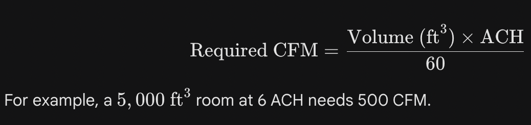 You need to calculate the volume of your room (Length Width Height in feet). Then, multiply the volume by the desired Air Changes Per Hour (ACH), typically 4 to 6 for remediation, and divide by 60 minutes.