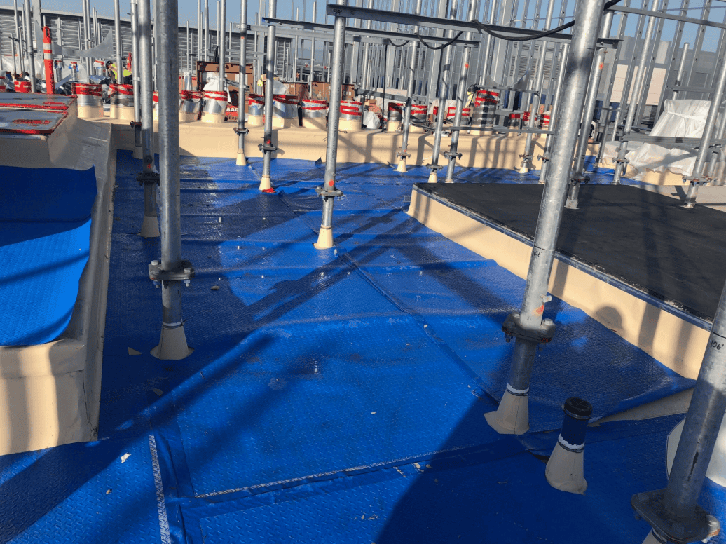 Traditional floor protection—such as rosin paper or corrugated plastic—often fails in "active" construction zones. These materials tear under the weight of scissor lifts, become slippery when wet, and pose significant fire risks.
