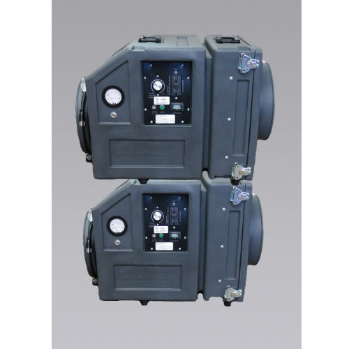 Light weight, dent and corrosion resistant portable mini air scrubber. This high performance unit features a variable speed control, 3 stage filtration with a 99.97% @ 0.3 micron HEPA filter, filter monitoring gauge, hour meter, and a 12" intake and exhaust flange. This unit is stackable and has the daisy chain capability to operate 4 units on one power cord.