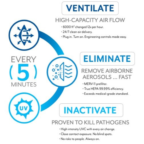 The air now passes through an IEST Certified, Tre HEPA filter rated at 99.99% removal efficiency at .3 microns. This removes bacteria, aerosolized or exhalation particles (virus carriers), mold spores, radon, smoke, silica, and other harmful ultra fine particles from the air.