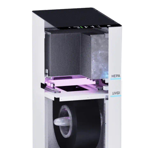The air now passes through an IEST Certified, Tre HEPA filter rated at 99.99% removal efficiency at .3 microns. This removes bacteria, aerosolized or exhalation particles (virus carriers), mold spores, radon, smoke, silica, and other harmful ultra fine particles from the air.